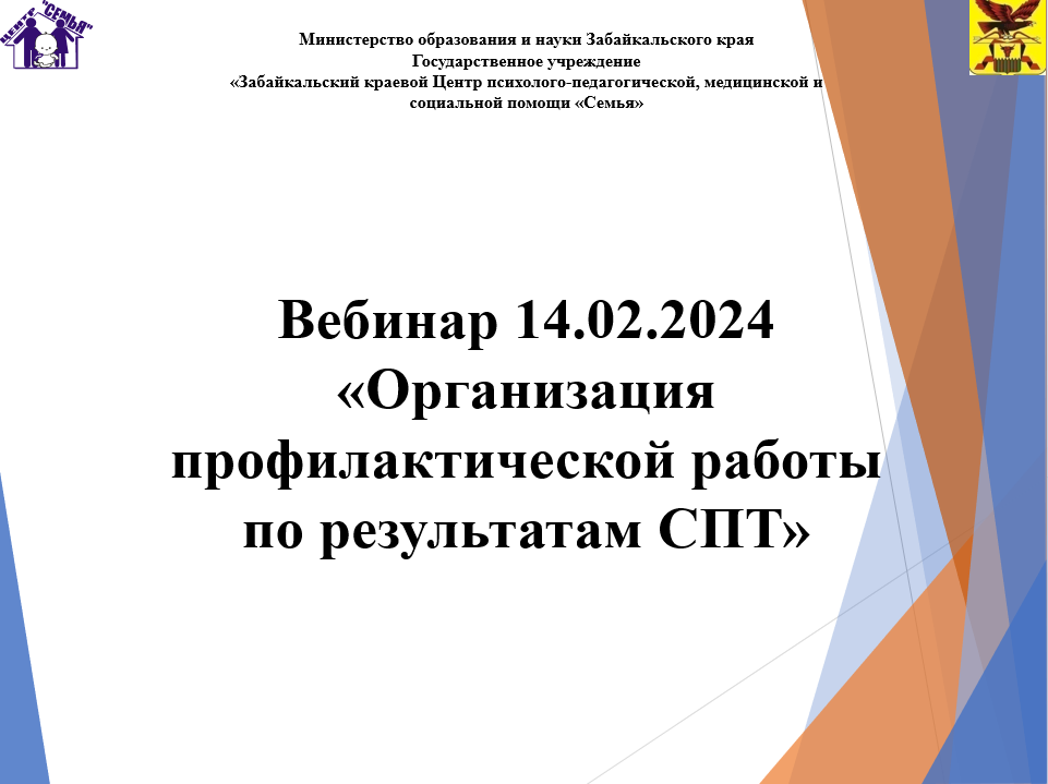 В целях оказания методической поддержки и обеспечения взаимодействия с муниципальными органами управления образованием ГУ «Забайкальский краевой Центр психолого-педагогической, медицинской и социальной помощи «Семья» 14 февраля 2024 года в 14.00 планируется проведение вебинара на тему «Организация профилактической работы по результатам СПТ».